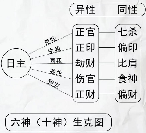 十神是指以生日天干五行为中心,按照五行生克关系划分出来的。分别是:生我者为印星(正印偏印),同我者为比劫(比肩劫财),我克者为财星(正财偏财),克我者为官杀(正官七杀),我生者为食伤(食神伤官)。这里的“我”也就是日主天干的五行,甲木、乙木、丙火、丁火、戊土、己土、庚金、辛金、壬水、癸水,其中甲、丙、戊、庚、壬为阳性,乙、丁、己、辛、癸为阴性。遇到与“我”五行阴阳属性相同的为正官、正财、正印、食神、比肩。与“我”五行阴阳属性相反的为偏官、偏财、偏印、伤官、劫财。
