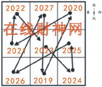 风水文昌位如上图,图片右上角是方位,每个方框正中间的黑点是每年的文昌位,文昌位沿着箭头方向每年变化。 2024年文昌位西北方,沿着箭头方向,2025年正西方,2026年东北方,2027年正南方。